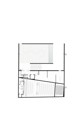 O vazio entre as empenas não é inerte. Dois maciços, perpendiculares aos planos verdes, brotam do chão para receber o pouso suave de duas grandes vigas e uma laje em balanço, formando uma praça em dois níveis. No nível inferior, por onde o público acessa a praça, a calçada invade o terreno até a metade de sua profundidade. Sob a sombra do grande balanço, um café propicia o lugar para a fala necessária, para o encontro dos velhos e novos amigos e também como local privilegiado para assistir a eventuais performances, que poderão acontecer no átrio externo, contínuo ao foyer do auditório. O nível de cima é a Praça Memorial e nela a vista não se dispersa: o espaço é reservado, um deck de madeira aberto apenas para o céu. O lugar é de silêncio espiritual, de meditação, do sentir e pensar. O que se pode ver, além das paredes verdes e um espelho d’água de borda infinita, são os 242 nomes gravados em baixo relevo nas grandes vigas de concreto aparente. O que se ouve é o som da água escorrendo suavemente.