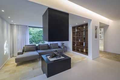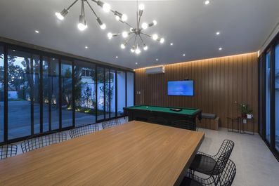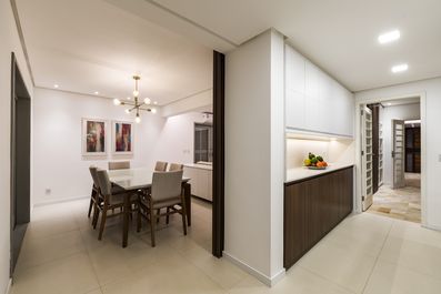 A construção da década de 1950, originalmente com fortes características modernistas corbusianas, sofreu sua primeira grande reforma no ano de 1982, tornando-se uma massa assentada sobre o chão que, através de molduras salientes em torno das aberturas, ativava um interessante jogo de sombras. Em 2016, a pedido dos atuais proprietários, a Kiefer Arquitetos deu início a uma nova reforma mantendo os traços obtidos na década de 1980, porém ajustando o espaço às necessidades da nova família. As lajes de forro, criadas para esconder as tubulações do ar condicionado central já obsoleto, foram removidas, possibilitando o aumento do pé direito. Rebaixos de gesso foram criados, o mais próximo possível das lajes estruturais, para dar acabamento às instalações e flexibilidade ao projeto luminotécnico. Paredes que super compartimentavam os ambientes do pavimento térreo foram retiradas, ampliando o living e tornando aparentes as vigas que orientaram os arquitetos no lançamento do partido. A importância da sustentabilidade era reconhecida pelos clientes e veio ao encontro dos ideais dos arquitetos que optaram pelo restauro das esquadrias e piso parquet do segundo pavimento. Novas entradas de luz natural foram criadas de forma estratégica, visando ampliar a sua incidência no interior da residência e otimizar a integração do interno com o externo. Placas solares foram instaladas junto ao telhado asa de borboleta sob platibanda para aquecimento d’água. Nos fundos do terreno, uma edícula coberta por kalhetões de cimento amianto usada como estacionamento, churrasqueira e serviço quebrava a possibilidade de uma solução harmônica para a construção de uma área de lazer e jardins tão estimada pelos novos moradores. Ali, não houve remédio, a edícula teve de ser refeita. Os arquitetos optaram por manter os alinhamentos, porém foram projetadas duas grandes vigas de concreto sarrafeado aparente que se estendem sobre os 19m de largura do terreno e servem de apoio para a laje vegetada. Sob os 135m² desta laje, estão o salão gourmet com espaço de jogos, closet para a moto e seus equipamentos, um lavabo, a lavanderia e um JK para hospedar visitas e funcionários. Tanto na casa quanto na edícula os arquitetos tiraram partido da textura e cor de elementos naturais, tais como pedras, concreto e madeira. Os mesmo materiais de revestimento e acabamento de mobiliário foram usados em toda a residência, conferindo unidade ao projeto e evitando desperdícios.